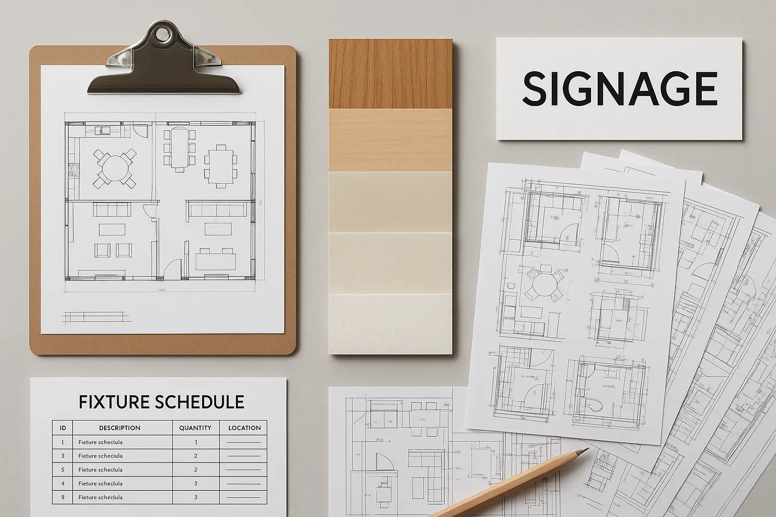We build design standards: fixture schedules, finish boards, signage specs, and shop-drawings to replicate across sites. Procurement support and VE options keep costs stable while preserving your look.